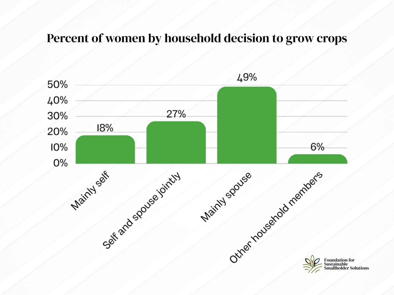 When asked who makes decisions about which crops to grow, only 18% of women reported deciding mainly on their own. Another 27% said decisions were made jointly with their spouse. But nearly half, 49%, said these decisions were made mainly by their spouse, while 6% pointed to other household members.